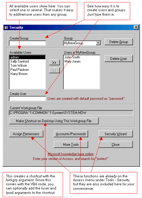To further streamline the process, it's so easy to add groups or add users. Just type them in. The Access wizard, on the other hand, requires clicking a button first and then typing. If you're adding a lot of users, you may find this a time-saver. This tool does not completely replace the Access wizard. The Access wizard gives you more control over passwords, but this tool automatically assigns a default password (again, the purpose is to streamline the process). And that's why this tool has an Accounts and Passwords button that goes to the built-in Access wizard. This gives you more flexibility over all. An extra feature is the button to create a desktop shortcut. Did you notice the desktop shortcut button in the screen print above? This comes in an Access 2000 database (which you can convert to your current version of Access). Most importantly, it comes with complete VBA code, giving you full control. You can tweak this tool to work any way you want. Make it your own tool. This easy-to-use security tool, fully customizable, complete with VBA code, is ready for download right now. It's only $19 with a satisfaction money-back guarantee. |