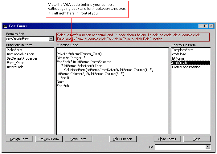 Forms VBA Code Development ToolMicrosoft Access, when designing forms, allows you to edit the VBA code for form and control events. But to get to the code is quite cumbersome. You have to click in a couple different places to get to it, and once you get to it, it's in a different window. If all you're doing is verifying the code, rather than writing the code, that's a lot of extra work to click in different places and to switch windows back and forth. How would you like a simpler code wizard that puts it all right in front of you? Instantly see the code you want. Then if you see something that needs changing, just one click takes you the code module. (Get guru tools now)