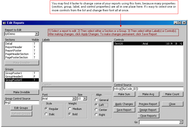 Report Designer Development ToolWhen modifying an Access report, do you forget which group sections are visible or invisible? Do you forget which fields are left aligned or right aligned? To figure out what's what, you have to click on each section or control and view it's properties. If you're trying to figure out a lot of things, that's a lot of clicking. How would you like to view all these properties in one place? And how would you like to have the power to change these properties all in one place? Here's a tool to put it all at your fingertips. (Get guru tools now)