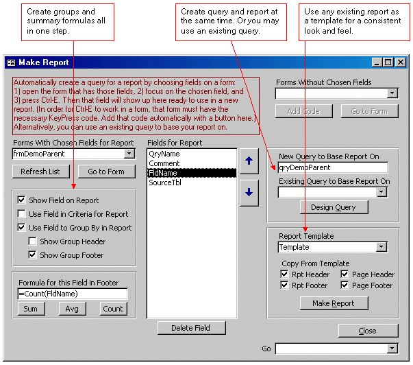 Report Creator Development ToolMaking reports in Microsoft Access traditionally has been a step-by-step process. First, you decide what fields you want on the report. Second, you figure out from what tables those fields come. Third, you make a query that grabs those fields. Fourth, you make a report based on that query. Fifth, you equally space the controls on the report. Sixth, you add summary controls to the footer. And there's probably more steps in between. I think I forgot changing the look and feel of the report to match your other reports. Can you skip most of these steps? Oh yes! My preferable method to create a report is the point-and-click method. It works like this. First, open the form that has the fields you want. Did I say the form? Not the table or a query? Yes, the form. Then focus on the first field and press Ctrl-E. That grabs the field. Do likewise for the rest of the fields that you want in your report. Just focus on the field and press Ctrl-E. That's all. (Tip: ask your client to make a screen print of the form and to circle the desired fields on the form. Then you won't have to guess which fields your client wants on the report, and you'll know on which fields to press Ctrl-E.) Next, use this development tool to create query and report with a click of a button. When done, you'll be pleased to see that your report has the look and feel of any template report you choose. Your fields will be equally spaced (if there's room). Your summary footer controls will be in place and positioned properly. Group headers and footers, as you choose, will be in place. And, if that's not enough, remember, this comes with the VBA source code so that you can automate and automate. (Get guru tools now)