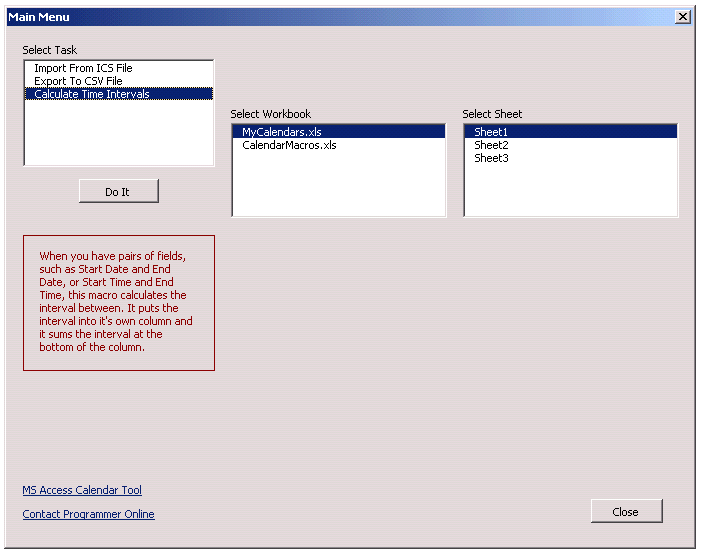 How to Import Calendar Events Into ExcelOther calendar programs can export events in an ICAL format (file with an ics extension). This macro imports that file into a spreadsheet. As it imports, you have control over what data goes into what column, and you do this by choosing a template. For example, if you want Subject, Start Date, End Date, in that order, then you can create a template with those fields in that order. You can easily create several customized templates. Then choose one, and the calendar events will import the way you want. ![]() How to Export Calendar Events From Excel to a CSV FileOther calendar programs can import comma-delimited (comma separated value) files. This macro exports spreadsheet data into a CSV file. That means you can first edit, manipulate, and format the data as you wish, in order to make it compatible with the target program. ![]() How to Calculate Days Between or Time Between DatesWhen you have pairs of fields, such as Start Date and End Date, or Start Time and End Time, this macro calculates the interval between. It puts the interval into it's own column, and it sums the interval at the bottom of the column. That means you can track hours worked or time spent. ![]() Buy And Download the Excel Calendar MacroDownload your Excel file with the macro now. Satisfaction money-back guarantee. Download $45 |