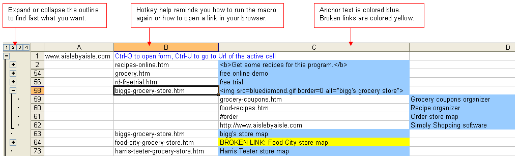 Make sense of the maze of links on your website. This affordable Excel tool automatically groups and outlines your web links. That means you can collapse and expand as you pinpoint parts of your site map to find faster, manage easier, and design more efficiently. This link checker tool searches a web site and places the links in outline format on an Excel spreadsheet. This format enables you to instantly target what part of the site map to view. More than that, you can also target what kind of links to check. This software finds three kinds of links in your website: